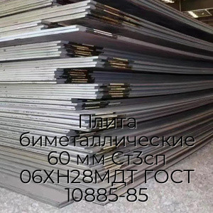 Компания «Арион-Металл» осуществляет поставку Плита биметаллические 60 мм Ст3сп 06ХН28МДТ ГОСТ 10885-85 со склада, а также предлагает услуги по доставке по Москве, Московской области и другим регионам России.