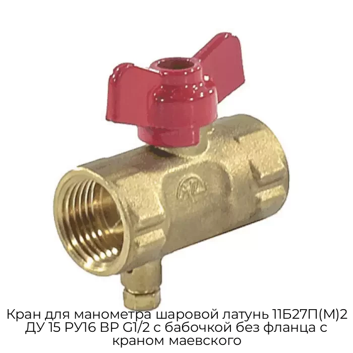 - Кран для манометра шаровой латунь 11Б27П(М)2 ДУ 15 РУ16 ВР G1/2 с бабочкой без фланца с краном маевского N94553