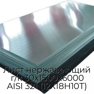 Лист нержавеющий 30х1500х6000 AISI 321 (08Х18Н10Т, 12Х18Н10Т) представляет собой один из самых востребованных видов листового металлопроката. Имеет прямоугольную форму, изготавливается в соответствии с ГОСТ 16523-97 с помощью деформации под давлением металла, находящегося в горячем состоянии. Материалом его изготовления выступает универсальная аустенитная сталь, дополнительная обработка поверхности не производится. Лист имеет следующие размеры: длина - 6000 мм, ширина - 1500 мм, толщина - 30 мм.