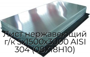 Лист нержавеющий 5х1500х3000 AISI 304 (08Х18Н10) представляет собой один из самых востребованных видов листового металлопроката. Имеет прямоугольную форму, изготавливается в соответствии с ГОСТ 16523-97 с помощью деформации под давлением металла, находящегося в горячем состоянии. Материалом его изготовления выступает универсальная аустенитная сталь, дополнительная обработка поверхности не производится. Лист имеет следующие размеры: длина - 3000 мм, ширина - 1500 мм, толщина - 5 мм.