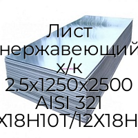 Лист нержавеющий 2,5х1250х2500 AISI 321 (08Х18Н10Т, 12Х18Н10Т) представляет собой один из самых востребованных видов листового металлопроката. Имеет прямоугольную форму, изготавливается в соответствии с ГОСТ 5582-75, ГОСТ 16523-97, ГОСТ 19904-90 с помощью деформации под давлением металла, находящегося в горячем состоянии. Материалом его изготовления выступает универсальная аустенитная сталь, дополнительная обработка поверхности не производится. Лист имеет следующие размеры: длина - 2500 мм, ширина - 1250 мм, толщина - 2,5 мм.