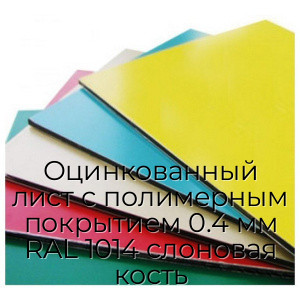 Оцинкованный лист с полимерным покрытием 0.4 мм RAL 1014 слоновая кость широко применяется в строительстве, производстве рекламных конструкций и других отраслях промышленности. Он используется для изготовления металлочерепицы, водосточных систем, заборов, облицовочных панелей, рекламных щитов и других элементов, требующих надежности и яркого цвета.