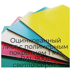 Оцинкованный лист с полимерным покрытием 1 мм RAL 9002 светло-серый широко применяется в строительстве, производстве рекламных конструкций и других отраслях промышленности. Он используется для изготовления металлочерепицы, водосточных систем, заборов, облицовочных панелей, рекламных щитов и других элементов, требующих надежности и яркого цвета.