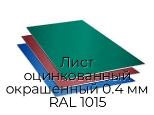 Лист окрашенный 0,4 мм оцинкованный представляет собой вид листового металлопроката прямоугольной формы, поверхность которого покрыта слоем цинка для надежной защиты от коррозии. Изготавливается из стали в соответствии с ГОСТ 19904-90, поверхность окрашена в цвет RAL 1015. Лист имеет следующие размеры: ширина - 1250 мм, толщина - 0,4 мм при толщине оцинкованного слоя 110-120 мк.
