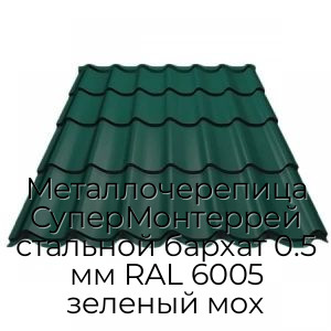 Металлочерепица СуперМонтеррей стальной бархат 0.5 мм RAL 6005 зеленый мох - продажа оптом и в розницу по цене от 695 руб. в Москве. Доставка по Москве и всей России