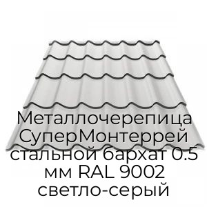 - Металлочерепица СуперМонтеррей стальной бархат 0.5 мм RAL 9002 светло-серый N4342