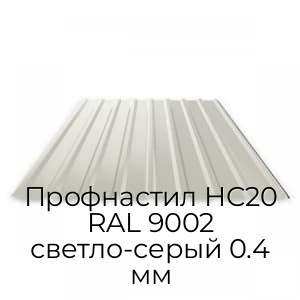 Профнастил НС20 RAL 9002 представляет собой стальной лист с рифлением, дополненный полимерным покрытием. Представлен в востребованном и универсальном графитовом сером оттенке и изготовлен с помощью современного профилегибочного оборудования в соответствии с требованиями ГОСТ. Имеет стандартизированные размеры: общей шириной 1150, мм и толщиной металла 0.4 мм.