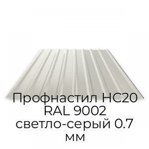 Профнастил НС20 RAL 9002 представляет собой стальной лист с рифлением, дополненный полимерным покрытием. Представлен в востребованном и универсальном графитовом сером оттенке и изготовлен с помощью современного профилегибочного оборудования в соответствии с требованиями ГОСТ. Имеет стандартизированные размеры: общей шириной 1150, мм и толщиной металла 0.7 мм.