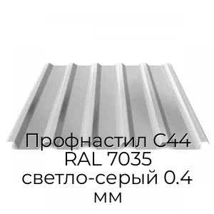 Профнастил С44 RAL 7035 представляет собой стальной лист с рифлением, дополненный полимерным покрытием. Представлен в востребованном и универсальном графитовом сером оттенке и изготовлен с помощью современного профилегибочного оборудования в соответствии с требованиями ГОСТ. Имеет стандартизированные размеры: общей шириной 1047, мм и толщиной металла 0.4 мм.