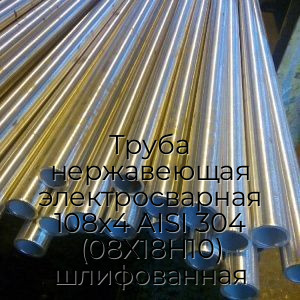 Труба нержавеющая электросварная AISI 304 08Х18Н10 — это полое внутри металлическое изделие, имеющее цилиндрическую форму и круглое сечение. Изготавливается в соответствии с ГОСТ 11068-81, ГОСТ 10704-91 из стальных листов, которые подвергаются гибке на специализированных станках с последующей автоматической сваркой шва. Отличается отполированной до блеска Шлифованной поверхностью. Имеет следующие стандартизированные размеры: фиксированная длина одной трубы - 6 метров, диаметр - 108 мм, толщина стенки - 4 мм.
