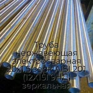 Труба нержавеющая электросварная AISI 201 12Х15Г9НД — это полое внутри металлическое изделие, имеющее цилиндрическую форму и круглое сечение. Изготавливается в соответствии с ГОСТ 11068-81, ГОСТ 10704-91 из стальных листов, которые подвергаются гибке на специализированных станках с последующей автоматической сваркой шва. Отличается отполированной до блеска Зеркальной поверхностью. Имеет следующие стандартизированные размеры: фиксированная длина одной трубы - 6 метров, диаметр - 20 мм, толщина стенки - 1,5 мм.