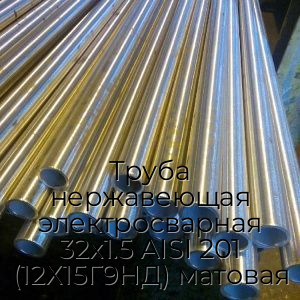 Труба нержавеющая электросварная AISI 201 12Х15Г9НД — это полое внутри металлическое изделие, имеющее цилиндрическую форму и круглое сечение. Изготавливается в соответствии с ГОСТ 11068-81, ГОСТ 10704-91 из стальных листов, которые подвергаются гибке на специализированных станках с последующей автоматической сваркой шва. Отличается отполированной до блеска Матовой поверхностью. Имеет следующие стандартизированные размеры: фиксированная длина одной трубы - 6 метров, диаметр - 32 мм, толщина стенки - 1,5 мм.