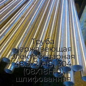 Труба нержавеющая электросварная AISI 304 08Х18Н10 — это полое внутри металлическое изделие, имеющее цилиндрическую форму и круглое сечение. Изготавливается в соответствии с ГОСТ 11068-81, ГОСТ 10704-91 из стальных листов, которые подвергаются гибке на специализированных станках с последующей автоматической сваркой шва. Отличается отполированной до блеска Шлифованной поверхностью. Имеет следующие стандартизированные размеры: фиксированная длина одной трубы - 6 метров, диаметр - 48,3 мм, толщина стенки - 2 мм.