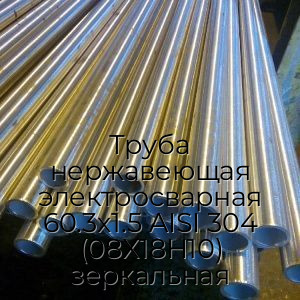 Труба нержавеющая электросварная AISI 304 08Х18Н10 — это полое внутри металлическое изделие, имеющее цилиндрическую форму и круглое сечение. Изготавливается в соответствии с ГОСТ 11068-81, ГОСТ 10704-91 из стальных листов, которые подвергаются гибке на специализированных станках с последующей автоматической сваркой шва. Отличается отполированной до блеска Зеркальной поверхностью. Имеет следующие стандартизированные размеры: фиксированная длина одной трубы - 6 метров, диаметр - 60.3 мм, толщина стенки - 1,5 мм.