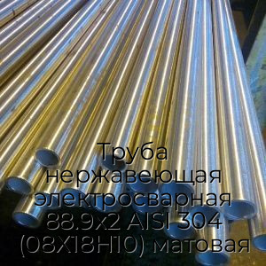 Труба нержавеющая электросварная AISI 304 08Х18Н10 — это полое внутри металлическое изделие, имеющее цилиндрическую форму и круглое сечение. Изготавливается в соответствии с ГОСТ 11068-81, ГОСТ 10704-91 из стальных листов, которые подвергаются гибке на специализированных станках с последующей автоматической сваркой шва. Отличается отполированной до блеска Матовой поверхностью. Имеет следующие стандартизированные размеры: фиксированная длина одной трубы - 6 метров, диаметр - 88.9 мм, толщина стенки - 2 мм.